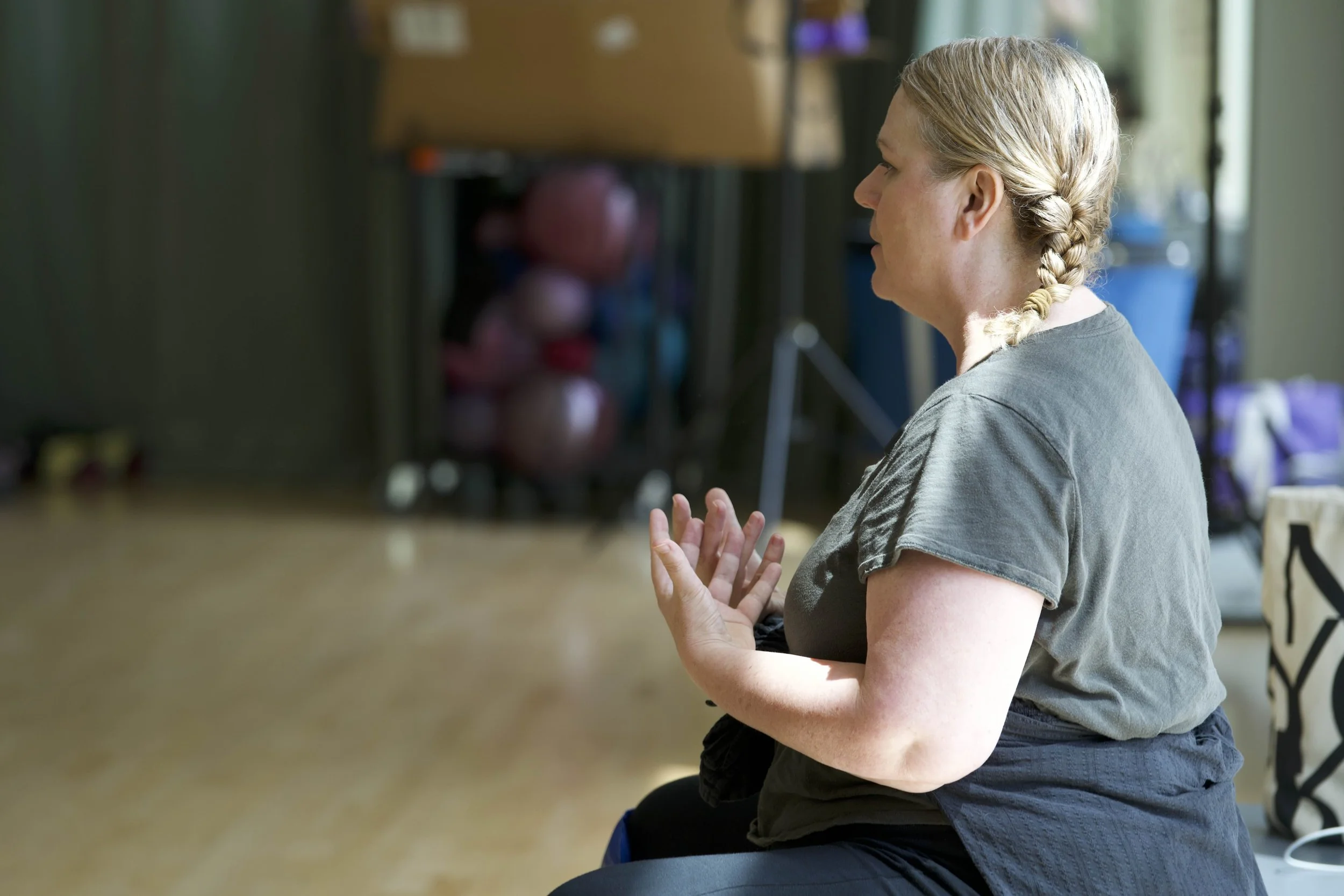 At its core, SBT reflects Shanahan’s recognition that vigorous, detailed, and spacious dancing need not come at the expense of a long-term relationship with one’s body, dancing, and performance. Her approach gently and tenaciously challenges cultural patterns of mistaking brutal control for artistry, fat phobia, ageism, the fetishization of form and youthfulness, and the overvaluation of an internalized surveilling center that functions as body’s “core.” SBT invites participants into a broader, more humane framework for movement, and spacious inquiries into beauty and virtuosity; one that embraces differentiated effort, non-linear expressivity, and trust in both gravity and the material body.
